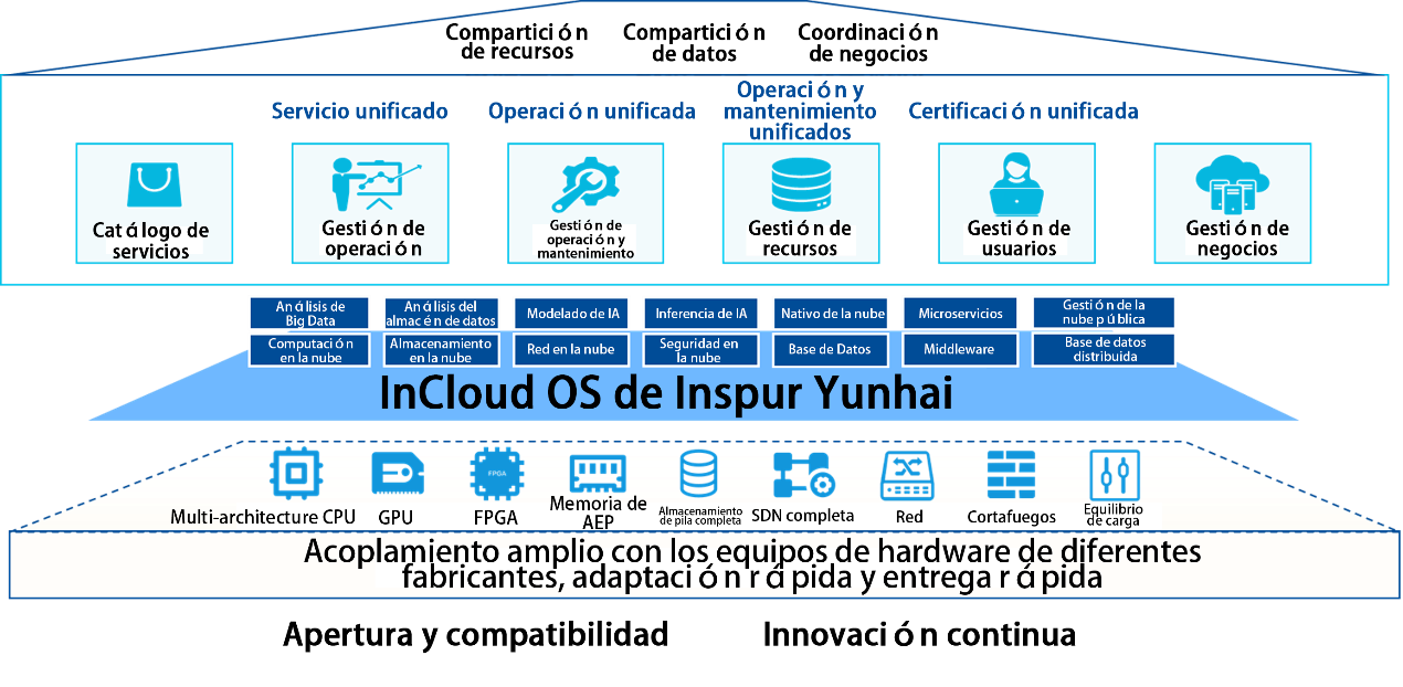 Basado en la idea de construcción de estratificación, desacoplamiento y estándares abiertos, InCloud OS de Inspur Cloud incluye principalmente la capa de infraestructura, la capa de plataforma, la capa de aplicación, el sistema de operación y mantenimiento y el sistema de protección de seguridad, y cumple los principios de diseño de modularización, estandarización, amplia compatibilidad, diseño independiente seguro y controlable, gestión unificada inteligente y eficiente. Cada módulo funcional puede combinarse libremente y disponerse bajo demanda para reducir los costos de adquisición de TI, y además, se adopta el diseño de sistema escalable para facilitar el desarrollo de los módulos de valor agregado y satisfacer las necesidades personalizadas de los usuarios. Se proporcionan a los clientes soluciones en la nube de pila completa.