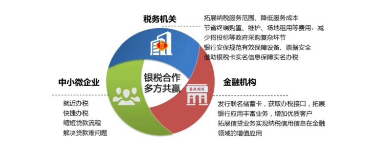 通过多方合作,银行和税务机关统筹设计,以税银合作自助服务网点建设为前提,以银行业金融机构网点等为合作场地,由银行出资购置自助设备和银行设备,负责门市装修与安防,纳税人或银行客户可在24小时自助服务网点就近选择办理涉税、金融事宜。利用银行丰富的网点资源拓展纳税人特别是小微企业纳税人的办税渠道。由税务机关向银行提供企业纳税信用评价结果,银行可快速向守信企业提供小额信用贷款、出口退税账户托管贷款等信贷及相关金融服务。通过银行和税务机关联名发行“银税卡”,拓展银行应用丰富业务,实现小微企业的实名办税。自助设备厂商利用现有的平台为纳税人、税务机关、银行三方提供服务。